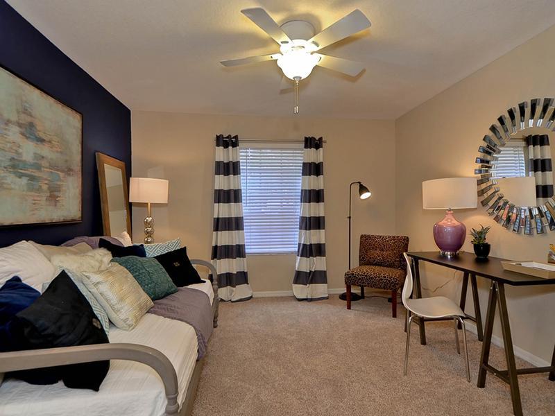 Apartment features can include high ceilings with fans, large windows with views, hardwood or carpet flooring, private patio or balcony, central air and heat, cable or satellite TV, high speed internet, walk-in closets, laundry facilities, a full bathroom and a fully equipped kitchen with black appliances.